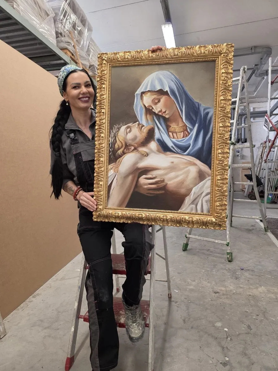 Dumnezeu mi-a ajutat și am reușit să-mi deschid al meu atelier în Padova care se numește BOTTEGA D’ARTE ANA MARIA. Am foarte comenzi și cele mai multe sunt comandate de pe TikTok. Foarte multe icoane am pictat dar și portrete. Am trimis tablouri și lui Florin Cercel, Paula Hriscu și multe alte vedete. Au fost portrete pe care le-am trimis cadou. Am trimis două icoane și la biserica din satul meu natal. Cea mai mare lucrare care a fost până acum este Cina Cea de Taină și va fi gata săptămâna viitoare, are dimensiunea 5m/3m și costă 8000 de euro. Un tablou pictat în frescă, cu dimensiunea de 1m/1m este vândut la 1200 €, iar cel în acrilic sau ulei cu această dimensiune este vândut la 900 €, a mai adăugat talentata artistă.