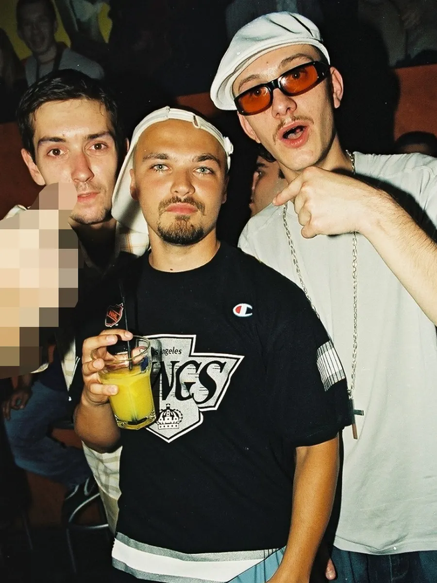În poză îi vedem pe Sișu, Puya și Don Baxter, tineri, slabi, cu fețe de cartier și priviri care spun tot. Nimeni nu poza pentru Instagram pe atunci. Nu existau filtre, nu exista PR. Era doar realitatea crudă: tricouri largi, lanțuri la gât, ochelari colorați, băutură în pahare și gestul pe care toți rapperii îl făceau fără jenă. Pentru cine nu știe vremurile, gestul acela nu era infantil. Era semn de sfidare, de „nu ne pasă”, de stradă pură. Azi ar părea copilăresc. Atunci era manifest.