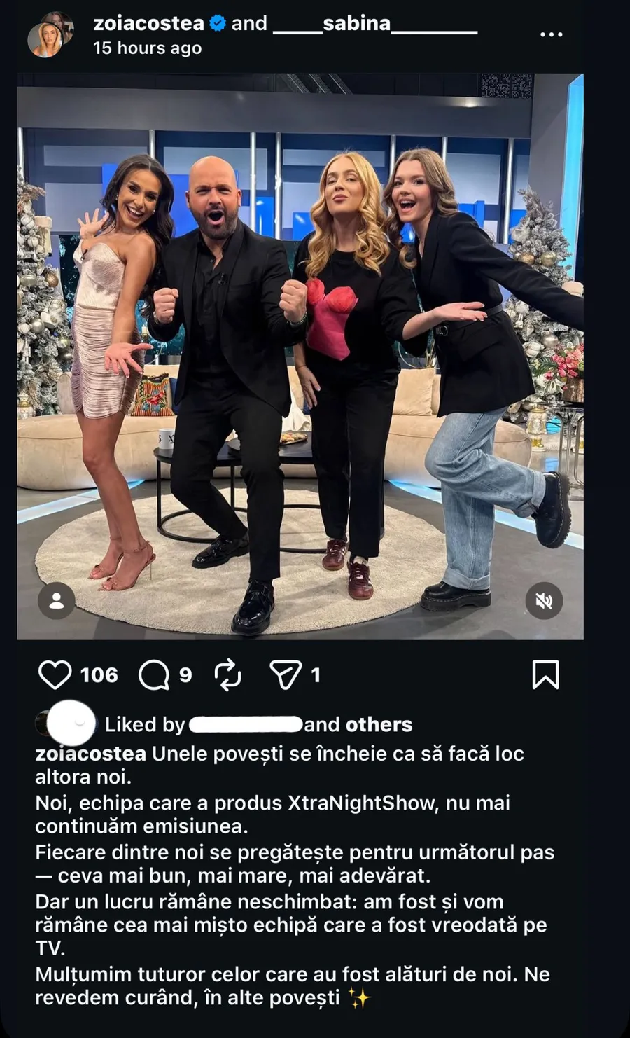 „Unele povești se încheie ca să facă loc altora noi. Noi, echipa care a produs Xtra Night Show, nu mai continuăm emisiunea. Fiecare dintre noi se pregătește pentru următorul pas – ceva mai bun, mai mare, mai adevărat.