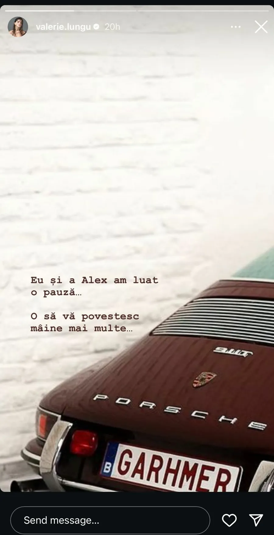 ”Eu și Alex am luat o pauză. O să vă povestesc mai mâine mai multe”, a fost mesajul influenceriței de pe o rețea de socializare.