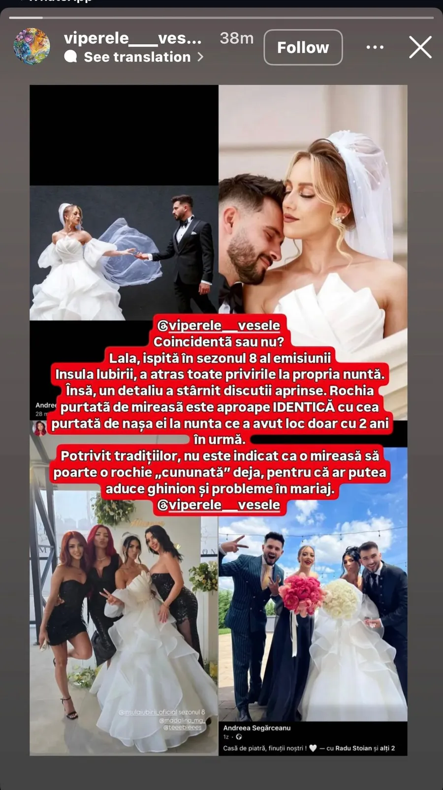 ”Coincindență sau nu? Lala, ispită în sezonul 8 al emisiunii Insula iubirii, a atras toate privirile la propria nuntă, însă, un detaliu a stârnit discuții aprinse. Rochia purtată de mireasă este aproape IDENTICĂ cu cea purtată de nașa ei la nunta ce a avut loc cu doi ani în urmă.