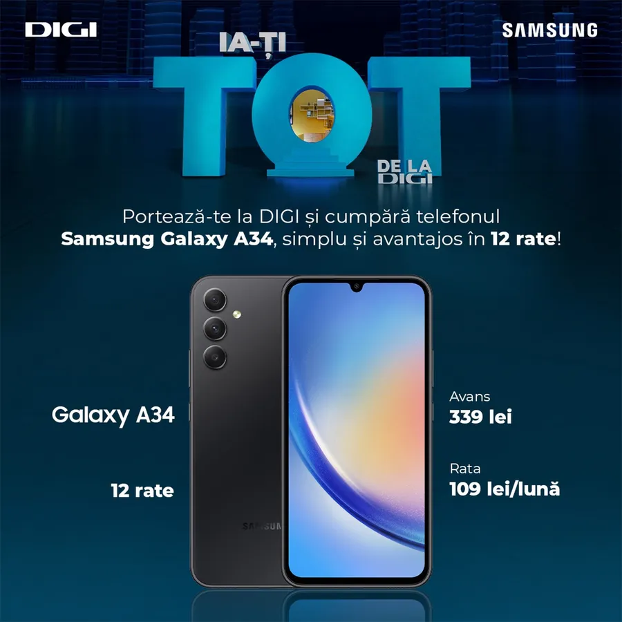 „Portează-te la DIGI și ai TOT ce-i mai bun pentru pasiunile tale. Cumpără Samsung Galaxy A34 și ai parte de cele mai tari fotografii, dar și de cea mai tare ofertă: îl plătești in 12 rate de câte 109 lei/luna + avans de 339 lei”, a transmis firma pe Facebook.