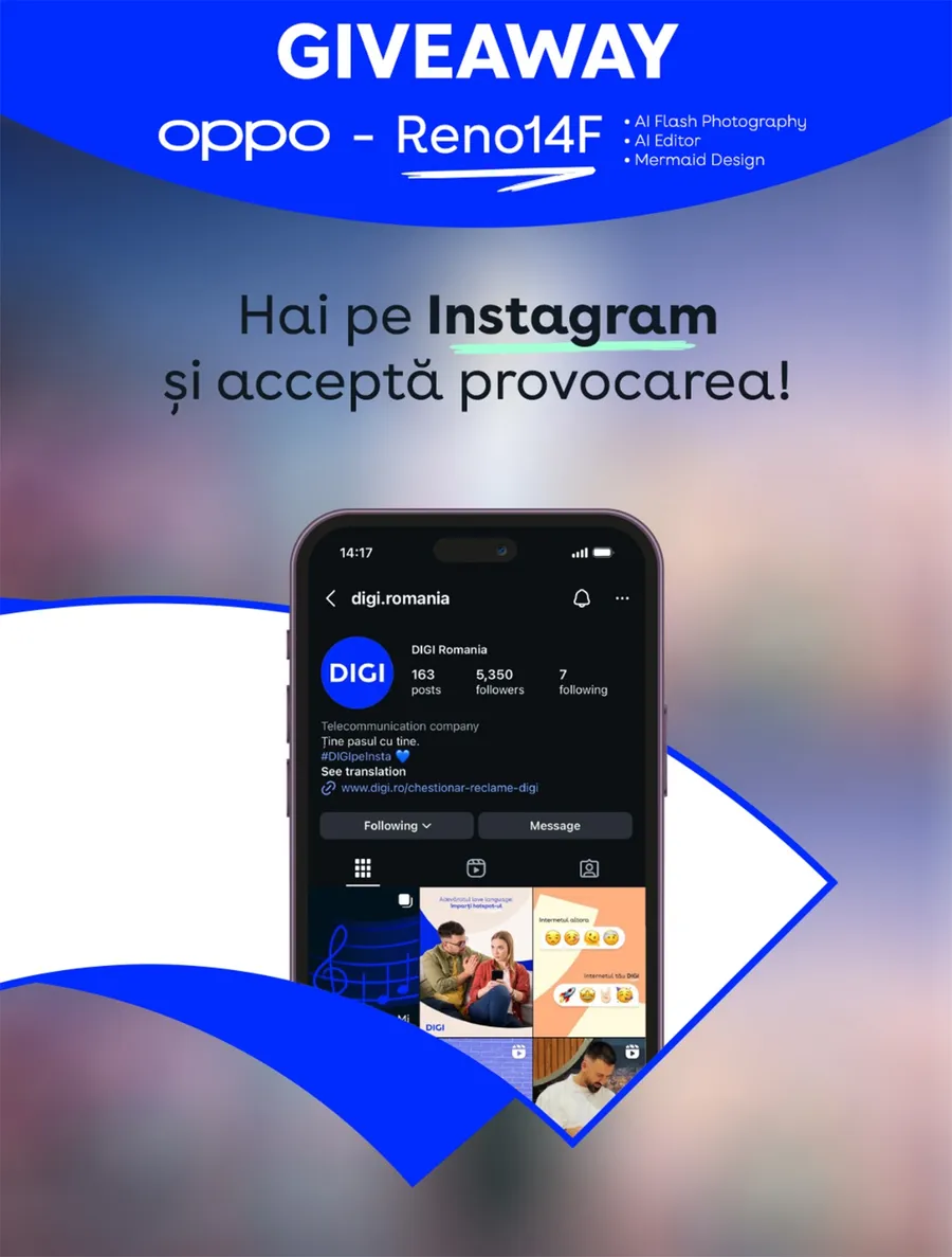 Premiul este unul special: trei abonați norocoși vor câștiga fiecare câte un OPPO Reno 14 F, iar concursul se desfășoară între 24 și 28 noiembrie. Câștigătorii vor fi anunțați pe 1 decembrie, printr-un comentariu la postarea oficială a provocării.