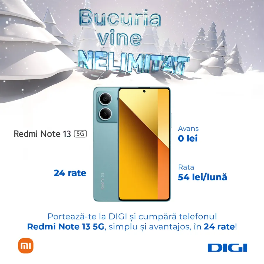 ”Performanță de top, design modern și tehnologie 5G – toate acestea pot fi ale tale. Portează-te la DIGI și poți cumpăra telefonul Redmi Note 13 5G, simplu și avantajos, în 24 de rate, cu doar 54 lei pe lună”, se arată în mesajul Digi RCS-RDS.