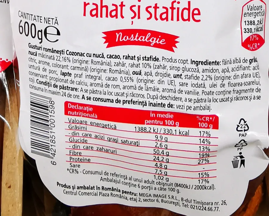 „Ingrediente: făină albă de grâu, nucă măcinată 2,16% (origine: România), zahăr, rahat 10% (zahăr, sirop glucoză, amidon, apă, acidifiant: acid citric, arome, colorant: carmină) (origine: România), ou, apă, drojdie, unt, stafide 2,2% (origine: din afara UE).