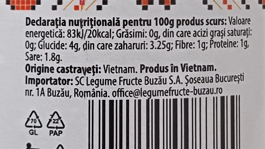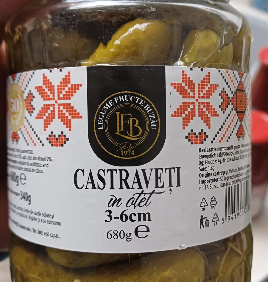 Totuși, la o privire mai atentă, cumpărătorii descoperă o realitate care îi surprinde: multe dintre borcanele cu castraveți murați asociate cu regiuni precum Buzăul nu au nicio legătură cu România. Sunt fabricate la peste 7.700 de kilometri distanță, în Vietnam, înainte de a ajunge pe mesele românilor.