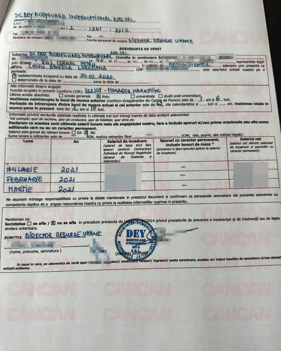 Numai că pe celebra adresă pont@cancan.ro au venit documentele care arată că fosta asistentă a lui Capatos ocupa funcția de manager marketing, era plătită lunar cu un salariu, spunem noi, destul de mare, și că de la acea firmă a lui Dani Leș a luat adeverința pentru a i se acorda creditul imobiliar. Iar contractul de muncă este pe perioadă nedeterminată, începând cu 20 octombrie 2020.