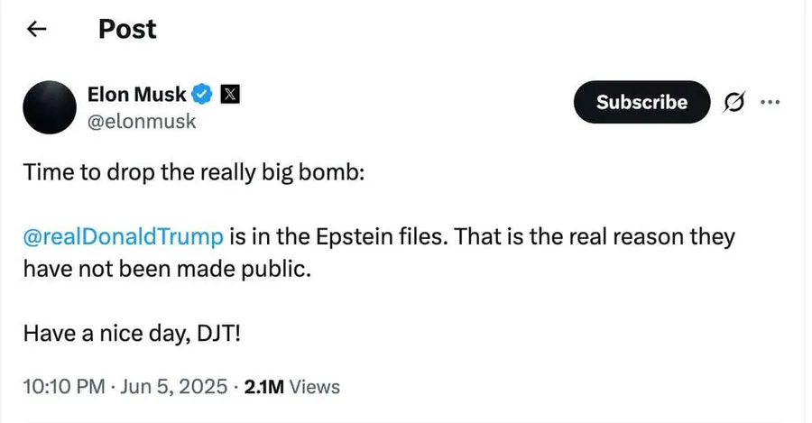 „Este timpul să arunc bomba reală: Donald Trump este în dosarul lui Epstein. Acesta este adevăratul motiv pentru care ei nu l-au făcut public. Să ai o zi bună, DJT!”, a scris Elon Musk.