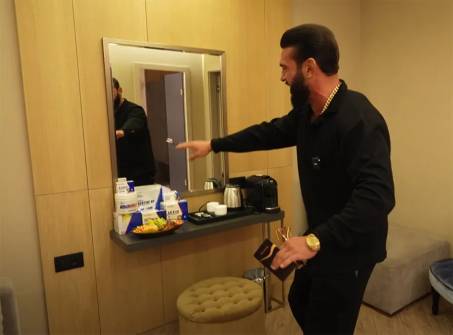 Camera cu un design modern i-a atras imediat atenția. Dorian Popa a apreciat pereții decorați cu gresie cu textură de lemn, oglinzile elegante și ușile din sticlă. Dormitorul spațios, cu un pat comod, a fost un alt punct forte, mai ales după o zi încărcată.