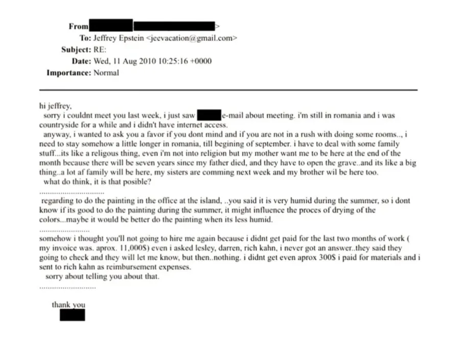 De asemenea, într-un alt email, o persoană al cărei nume nu apare, l-a contactat pe Epstein în 2010. Însă se discută despre picturi și despre faptul că această persoană nu și-a primit banii pentru ultimele două luni.