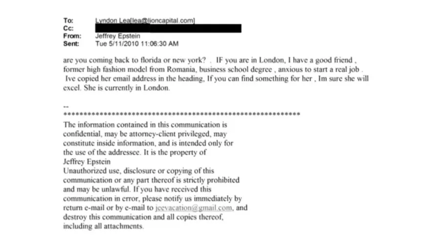 Într-un email din 2010, Jeffrey Epstein îi cere lui Lyndon Lea, fondatorul Lion Capital, să o ajute pe o prietenă, fostă fotomodel în România, care se află la Londra și abia așteaptă să își găsească ceva de lucru. Epstein îi forwardează lui Lyndon adresa de mail a româncei și îl asigură că va performa în orice job i-ar găsi.