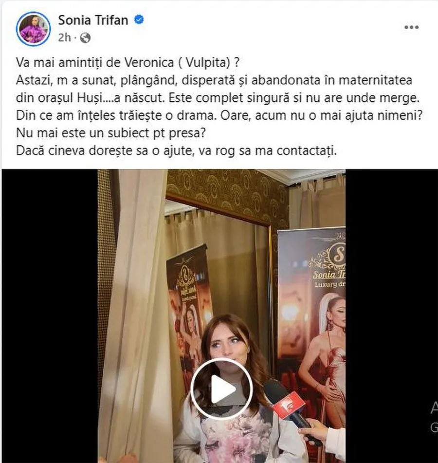 „Vă mai amintiți de Veronica (Vulpița)? Astăzi m-a sunat plângând, disperată și abandonată în maternitatea din orașul Huși. A născut. Este complet singură și nu are unde merge. Din ce am înțeles, trăiește o dramă. Oare acum nu o mai ajută nimeni? Nu mai este un subiect pentru presă? Dacă cineva dorește să o ajute, vă rog să mă contactați”