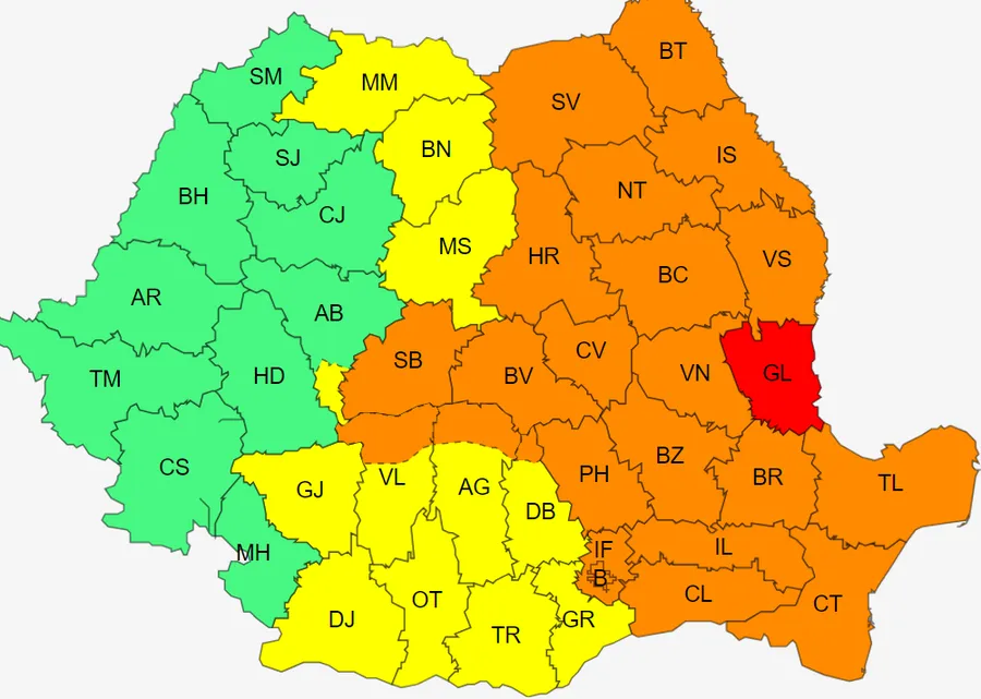 ANM a emis o avertizare de cod roșu, valabilă în județul Galați, din noaptea aceasta de la ora 24:00 și până mâine dimineață, la ora 9:00. Fenomenele vizate sunt ploi torențiale și abundente.