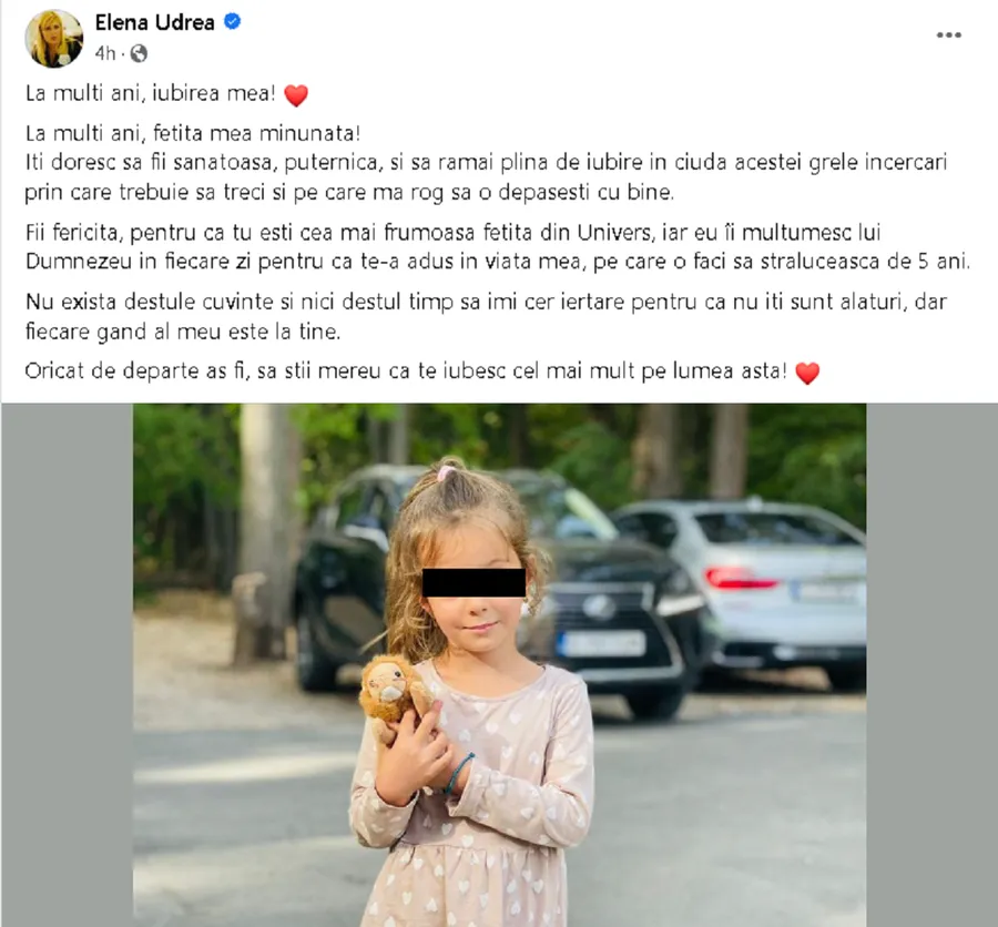 ”La mulți ani, iubirea mea! La mulți ani, fetița mea minunată! Îți doresc să fii sănătoasă, puternică și să rămâi plină de iubire în ciuda acestei grele încercări prin care trebuie să treci și pe care mă rog să o depășești cu bine. Fii fericită, pentru că tu ești cea mai frumoasă fetiță din Univers, iar eu îi mulțumesc lui Dumnezeu în fiecare zi pentru că te-a adus în viața mea, pe care o faci să strălucească de 5 ani. Nu există destule cuvinte și nici destul timp să îmi cer iertare pentru că nu îți sunt alături, dar fiecare gând al meu este la tine. Oricât de departe aș fi, să știi mereu că te iubesc cel mai mult pe lumea asta”, a fost mesajul Elenei Udrea de pe Facebook.