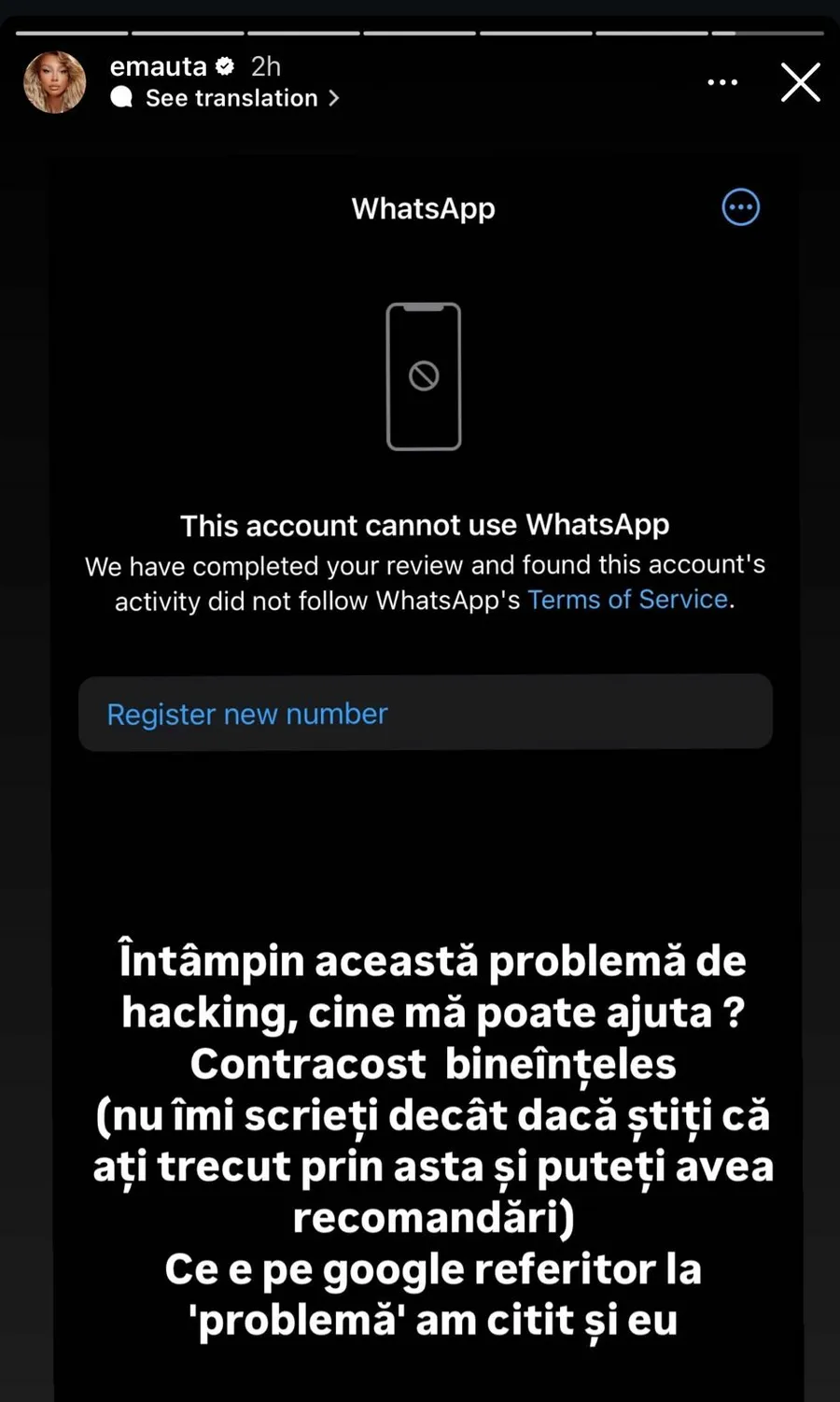 „Întâmpin această problemă de hacking, cine mă poate ajuta? Contracost, bineînțeles (nu îmi scrieți decât dacă știți că ați trecut prin asta și puteți avea recomandări). Ce e pe google referitor la problemă am citit și eu”, a scris Ema Uta pe InstaStory.