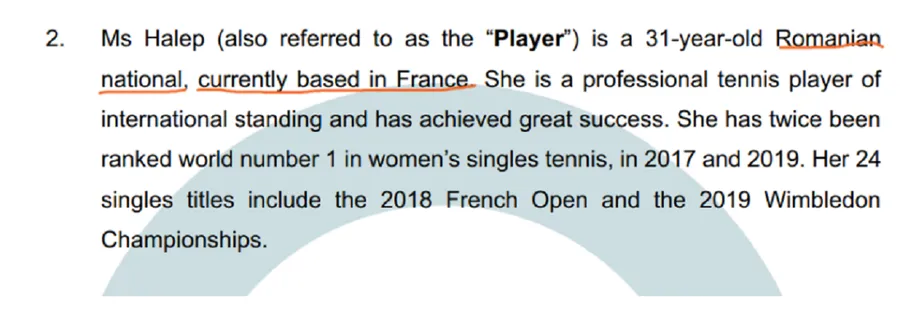 „Doamna Halep este un cetățean român de 31 de ani, în prezent stabilită în Franța. Este o jucătoare profesionistă de tenis cu reputație internațională și a obținut un mare succes în carieră. A fost de două ori pe locul 1 mondial la simplu, în 2017 și 2019. Ea are 24 titluri de simplu, incluzând Roland Garros 2018 și Wimbledon 2019”, se arată în prezentarea tribunalului.