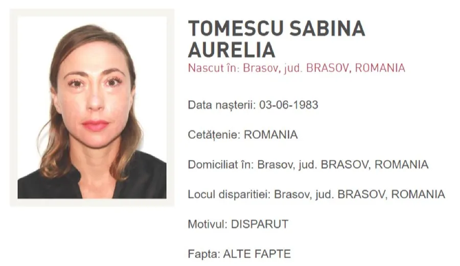 „La data de 25.06.2024 numita Tomescu Sabina Aurelia a plecat de la adresa de domiciliu cu intenția de a se deplasa în Belgia, iar de la acea dată nu a mai luat legătura cu membrii de familile. Semnalmente: înaltime:163 cm, greutate: 50 kg, corpolență: slabă, ochi căprui și păr blond de lungime mijlocie”, se arată pe site-ul Poliției Române.