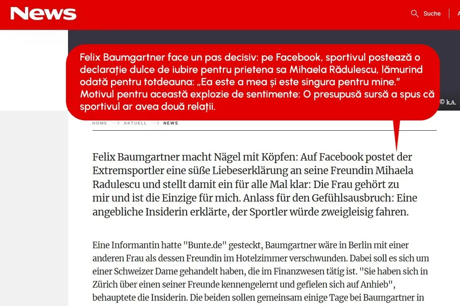 Potrivit publicației, zvonurile au apărut inițial pe Bunte.de, una dintre cele mai cunoscute reviste mondene din Germania. O sursă anonimă susținea că Felix Baumgartner ar fi fost surprins într-o cameră de hotel din Berlin în compania unei femei de naționalitate elvețiană, care lucrează în domeniul financiar. Aceasta nu ar fi fost doar o aventură de o noapte, ci o relație secretă, consolidată prin pasiunea comună pentru sporturile extreme.
