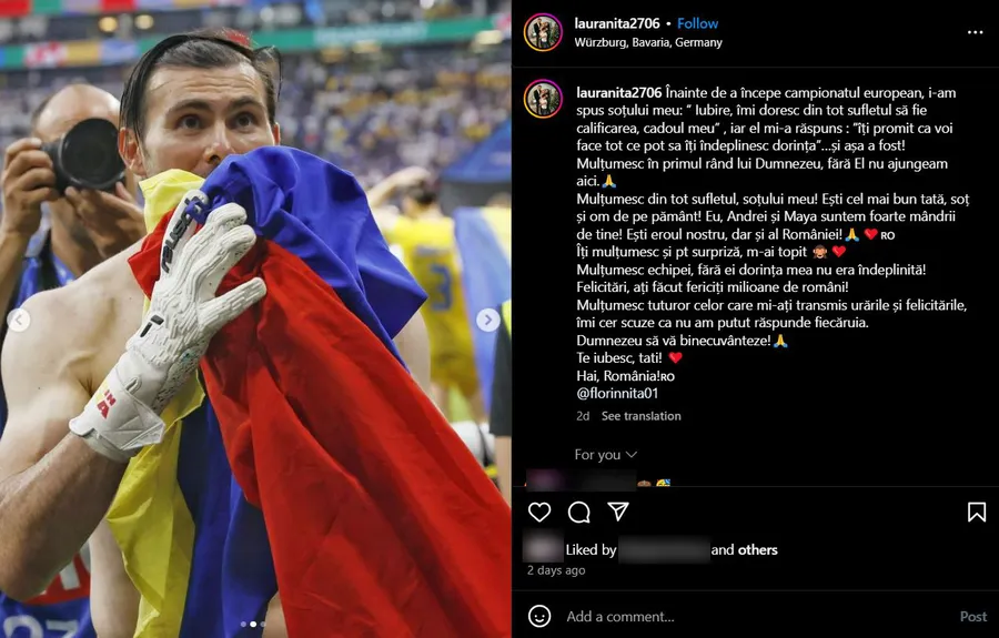 Îți mulțumesc și pentru surpriză, m-ai topit! Mulțumesc echipei, fără ei dorința mea nu era îndeplinită! Felicitări, ați făcut fericiți milioane de români! Mulțumesc tuturor celor care mi-ați transmis urările și felicitările, îmi cer scuze ca nu am putut răspunde fiecăruia. Dumnezeu să vă binecuvânteze! Te iubesc, tati! Hai, România!”, este mesajul notat de Laura Niță, soția portarului român, pe Instagram.