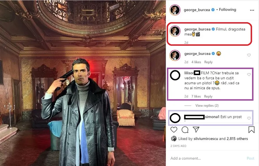 Actorul George Burcea a publicat pe contul său de Instagram o nouă poză realizată pe platourile de filmare a unei pelicule din care face parte. În imaginea care a stârnit multă revoltă, el apare în timp ce își ține un pistol la tâmpla dreaptă, iar felul în care a ales să fie imortalizat și mesajul pe care l-a pus la descriere sunt parcă din două “filme” separate.