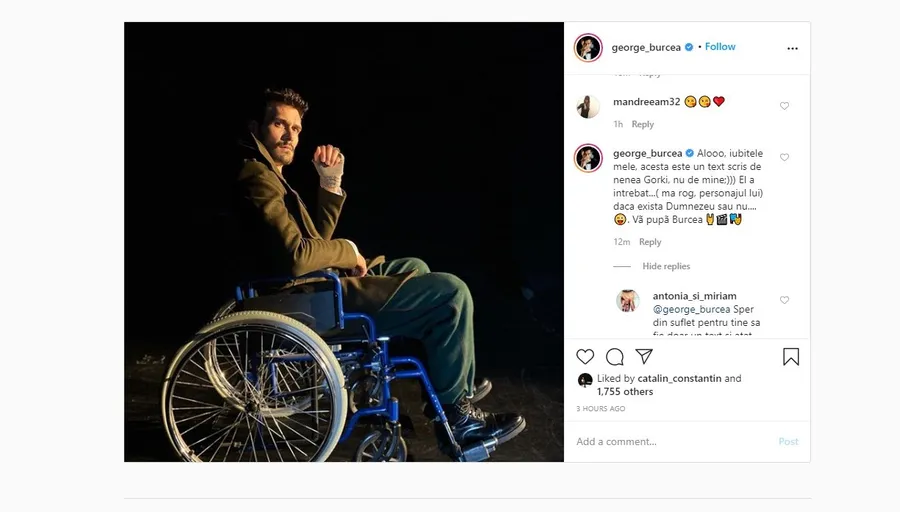După ce a primit multe întrebări și sfaturi, Burcea a ținut să explice: „Alooo, iubitele mele, acesta este un text scris de nenea Gorki, nu de mine;))) El a întrebat…( mă rog, personajul lui) dacă există Dumnezeu sau nu….?. Vă pupă Burcea”.