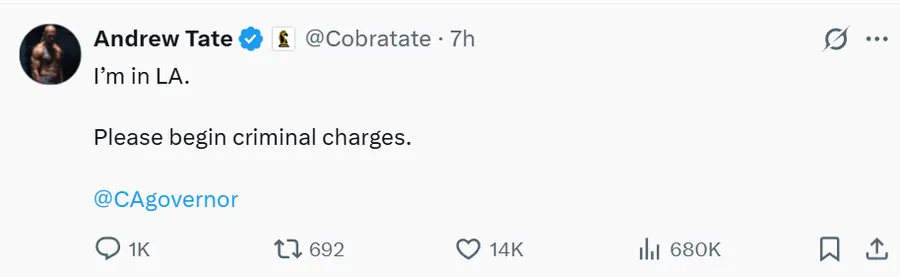 Între timp, Andrew Tate și-a anunțat sosirea în Los Angeles prin intermediul unei postări pe rețelele de socializare. De asemenea, el a transmis și un mesaj sarcastic pentru guvernatorul Californiei.