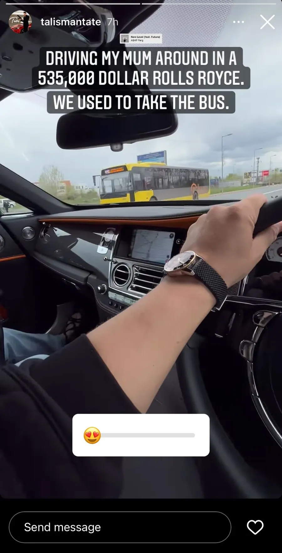 În dreptul Instastory-ului, fratele lui Andrew ”Cobra” Tate a notat că, înainte de a avea o mașină prețioasă, se plimba cu autobuzul.