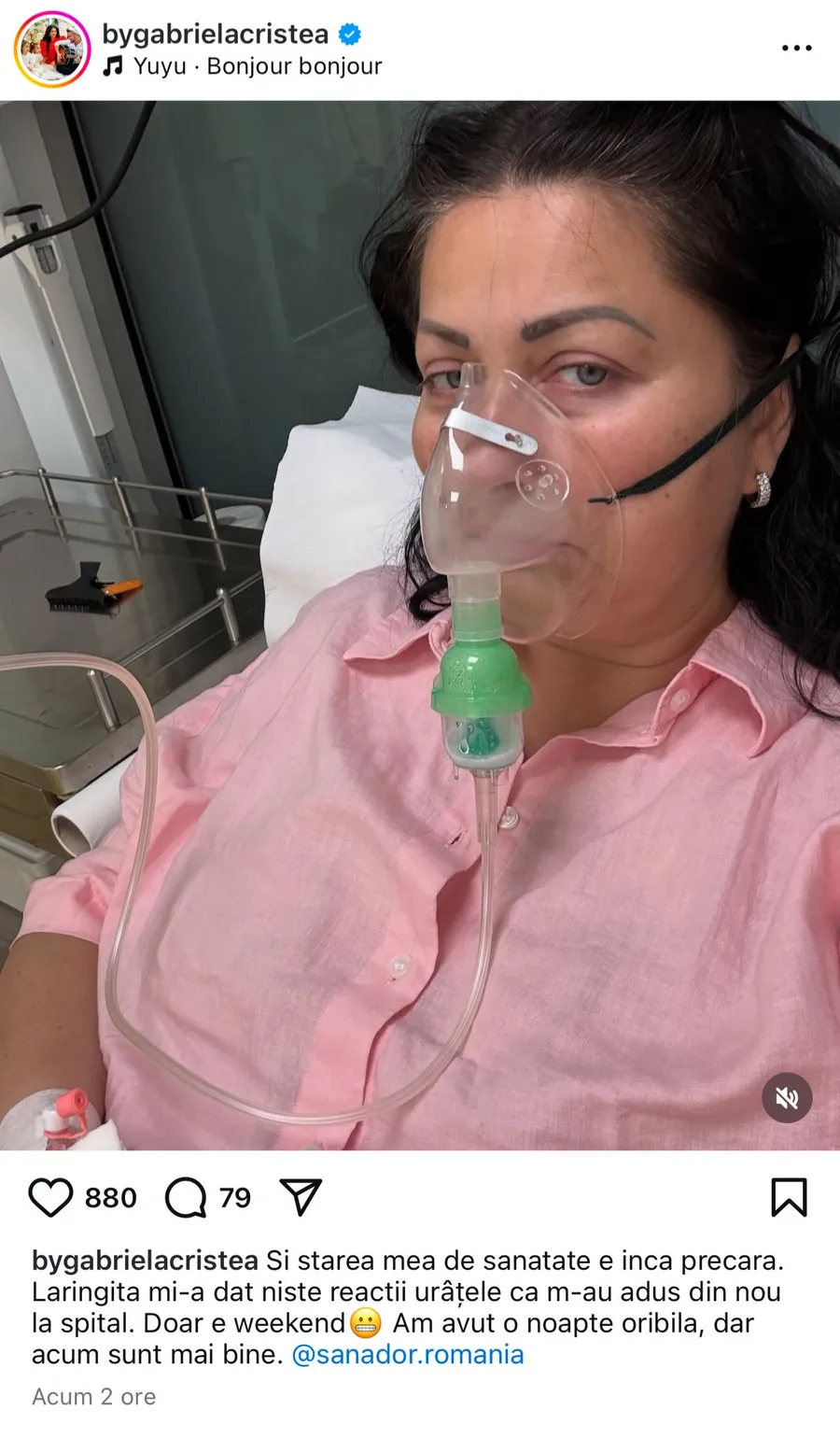 „Și starea mea de sănătate e încă precară. Laringita mi-a dat niște reacții urâțele că m-a adus din nou la spital. Doar că e weekend. Am avut o noapte oribilă, dar acum sunt mai bine”, a scris Gabriela Cristea pe Instagram.