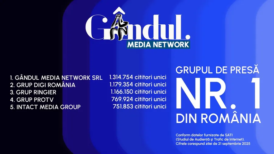 Mai mult, Grupul de presă GÂNDUL NETWORK MEDIA a fost duminică, 21 septembrie 2025, liderul absolut al internetului în România, iar site-ul GÂNDUL s-a plasat pe prima poziție în topul celor mai citite publicații online.