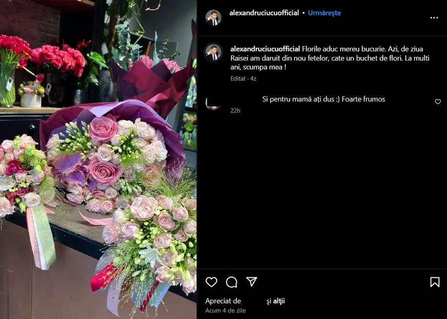 „Florile aduc mereu bucurie. Azi, de ziua Raisei am dăruit din nou fetelor câte un buchet de flori. La mulți ani, scumpa mea!”, se arată în postarea făcută de Alex Ciucu.