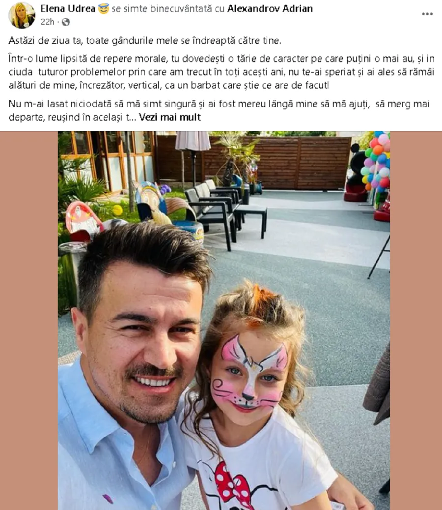 Nu m-ai lăsat niciodată să mă simt singură și ai fost mereu lângă mine să mă ajuți, să merg mai departe, reușind în același timp să fii și iubit, partener, prieten, dar și mamă și tată pentru fetița noastră în lipsa mea. Știu că nu este deloc ușor să crești de unul singur o fetiță atât de mică, și pentru asta îți mulțumesc! Ești un tătic dedicat, responsabil, iar faptul că te avem în viața noastră, este un dar neprețuit! La Multi Ani!”, a fost mesajul Elenei Udrea de pe Facebook.