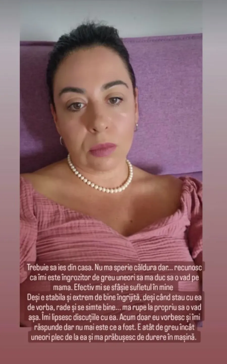 „Trebuie să ies din casă. Nu mă sperie căldura, dar recunosc că îmi este îngrozitor de greu uneori să o văd pe mama. Efectiv mi se sfâșie sufletul în mine. Deși e stabilă și extrem de bine îngrijită, deși când stau cu ea de vorbă râde și se simte bine… mă rupe la propriu să o văd așa. Acum doar eu vorbesc și îmi răspunde, dar nu mai este ce a fost. E atât de greu încât uneori plec de la ea și mă prăbușesc de durere în mașină”, a dezvăluit Oana Roman, pe Instagram.