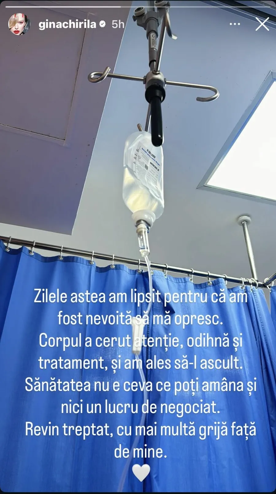 „Zilele astea am lipsit pentru că am fost nevoită să mă opresc. Corpul a cerut atenție, odihnă și tratament, și am ales să-l ascult. Sănătatea nu e ceva ce poți amâna și nici un lucru de negociat. Revin treptat, cu mai multă grijă față de mine”, a transmis Gina Chirilă în descrierea fotografiei.