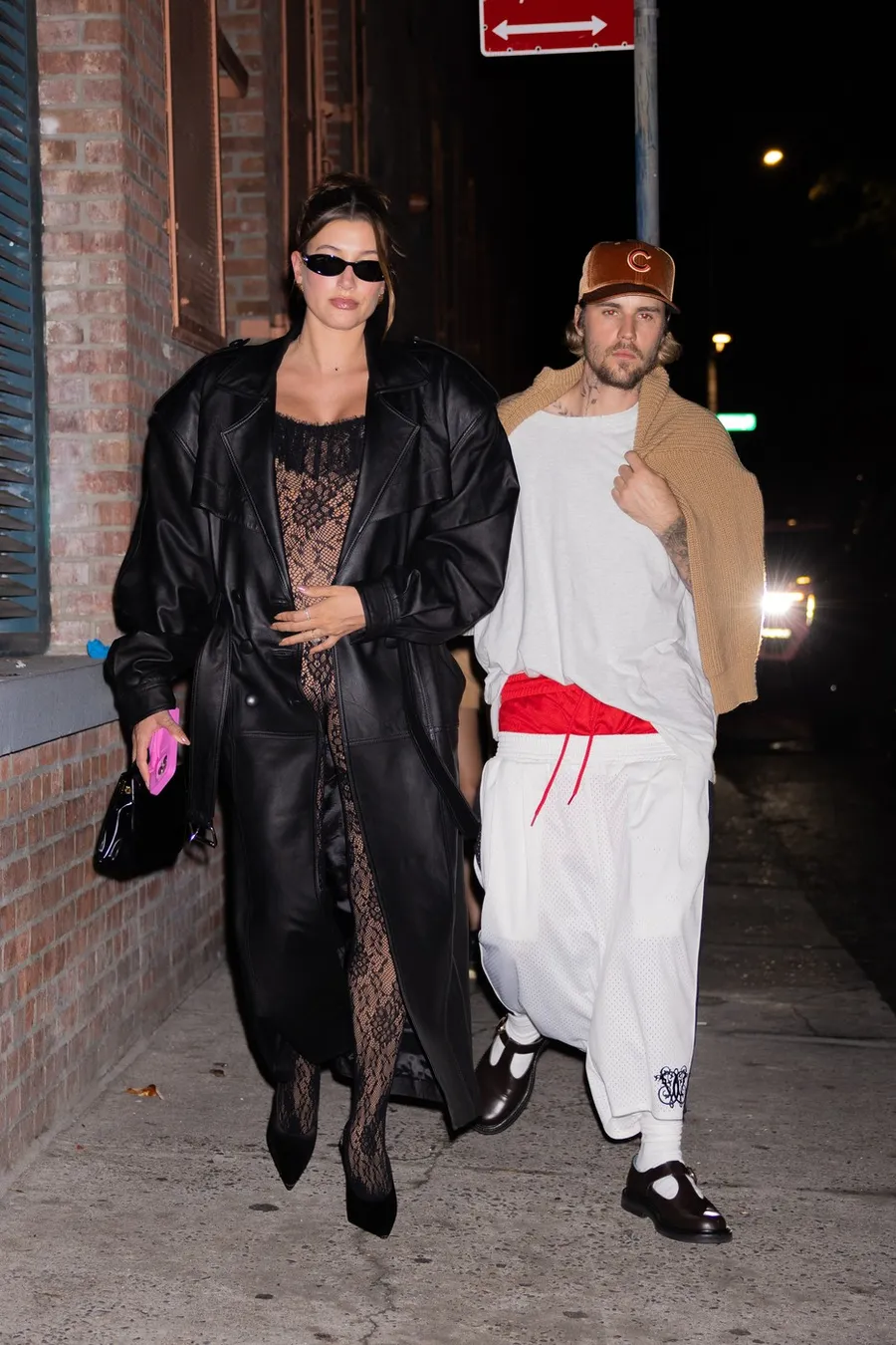 Hailey Biber, într-un trenci negru, de piele, și un body de dantelă, în aceeași nuanță, cu cohelari și geantă (sursa FOTO: Profimedia)