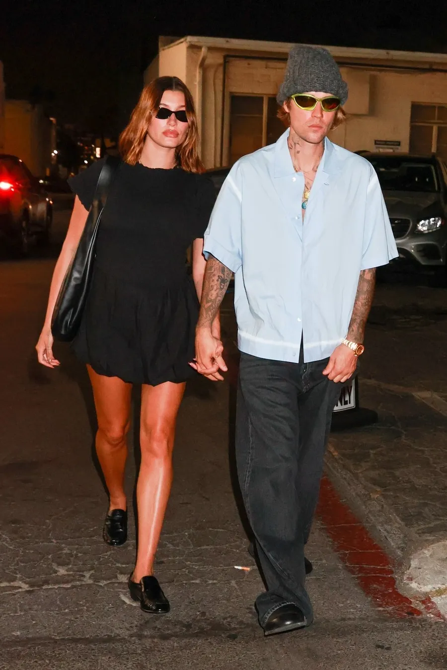 5. Hailey Biber, într-o rochiță neagră, babydoll, cu geantă neagră, ochelari negri și pantofi în aceeași nuanță (sursa FOTO: Profimedia)