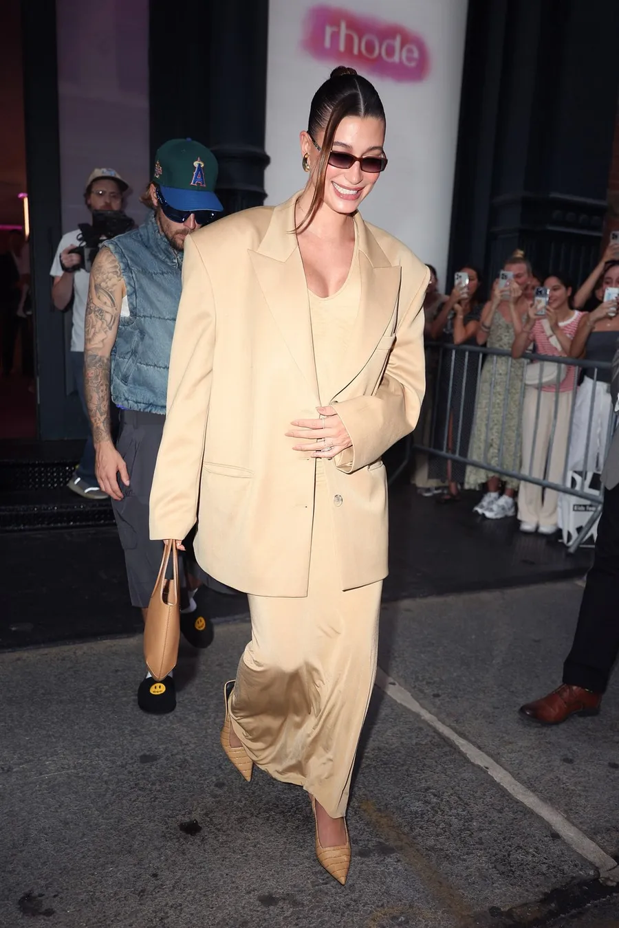 Hailey Biber, într-un blazer oversized bej/maro și rochie mulată, în aceeași nuanță (sursa FOTO: Profimedia)