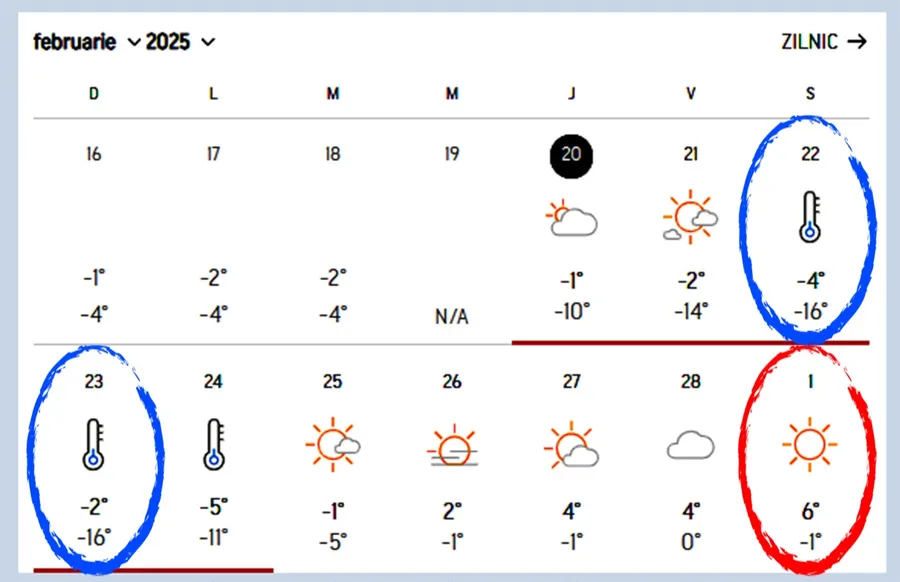 Însă, de aici încolo, vremea își schimbă radical cursul. De săptămâna viitoare, temperaturile vor începe să crească treptat, iar până sâmbătă viitoare, 1 martie, bucureștenii vor avea parte de temperaturi pozitive. Mai exact, maximele vor ajunge la 6 grade Celsius în timpul zilei, ceea ce înseamnă o creștere spectaculoasă de 22 de grade față de acest weekend.