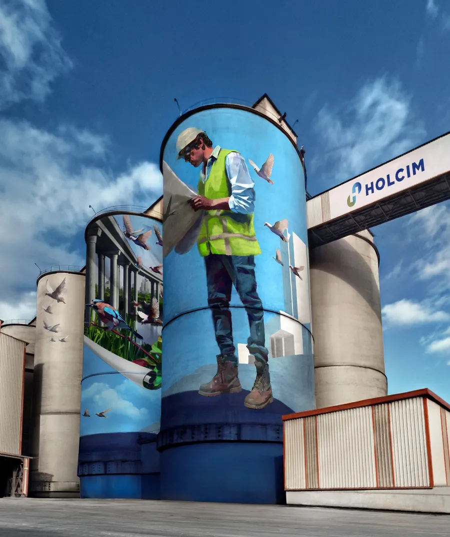 București, 4 martie 2026 – Holcim România, parte a grupului global Holcim, marchează o nouă etapă în strategia sa de sustenabilitate prin realizarea celui mai amplu mural sustenabil pe o fabrică din România. Lucrarea, cu o suprafață de aproximativ 2.800 mp, a fost realizată pe trei silozuri de ciment din cadrul fabricii Holcim din Câmpulung și este vizibilă din DN72A.