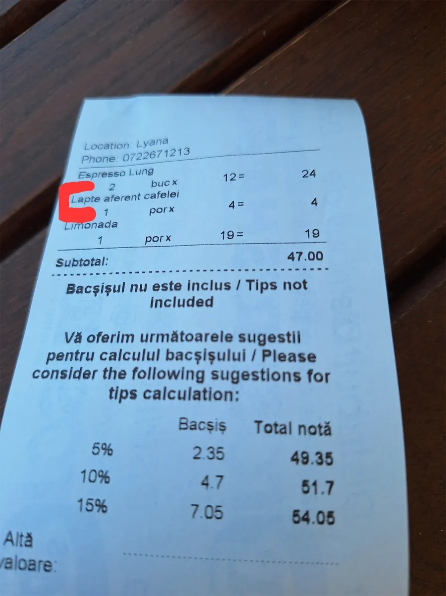 Mai exact, bărbatul a mers la o terasă pentru a se răcori cu o limonadă și a-și bea cafeaua de dimineață. Nimic extravagant. A comandat o cafea cu lapte și o limonadă, dar la final a descoperit cu stupoare că are de plătit trei produse. Limonada – 19 lei. Cafeaua – 12 lei. Și apoi, surpriză: „laptele aferent cafelei”, trecut ca produs separat pe notă, la prețul de 4 lei.