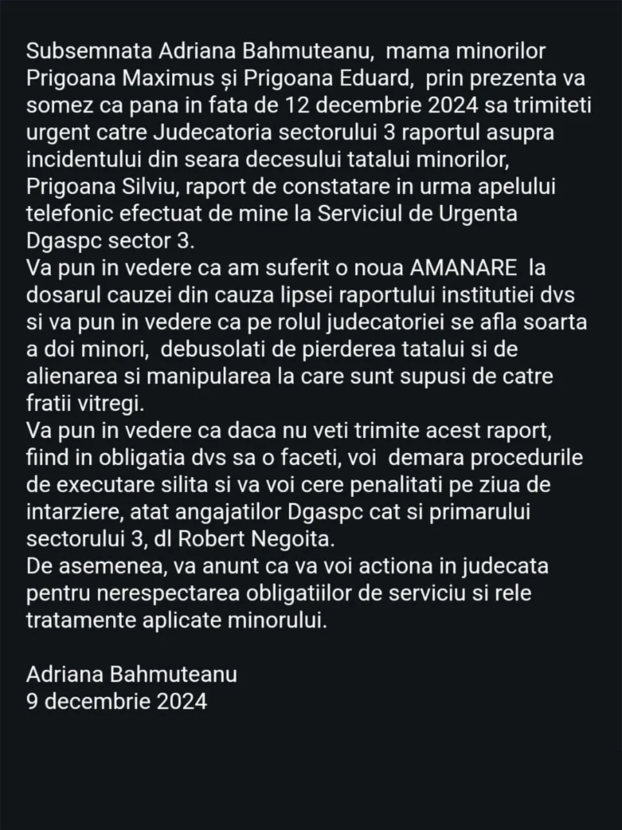 ”Vă somez ca până la data de 12 decembrie 2024 să trimiteți urgent către Judecătoria Sectorului 3 raportul asupra incidentului din seara decesului tatălui minorilor, raport de constatare în urma apelului telefonic efectuat de mine la Serviciul de Urgență DGASPC Sector 3.