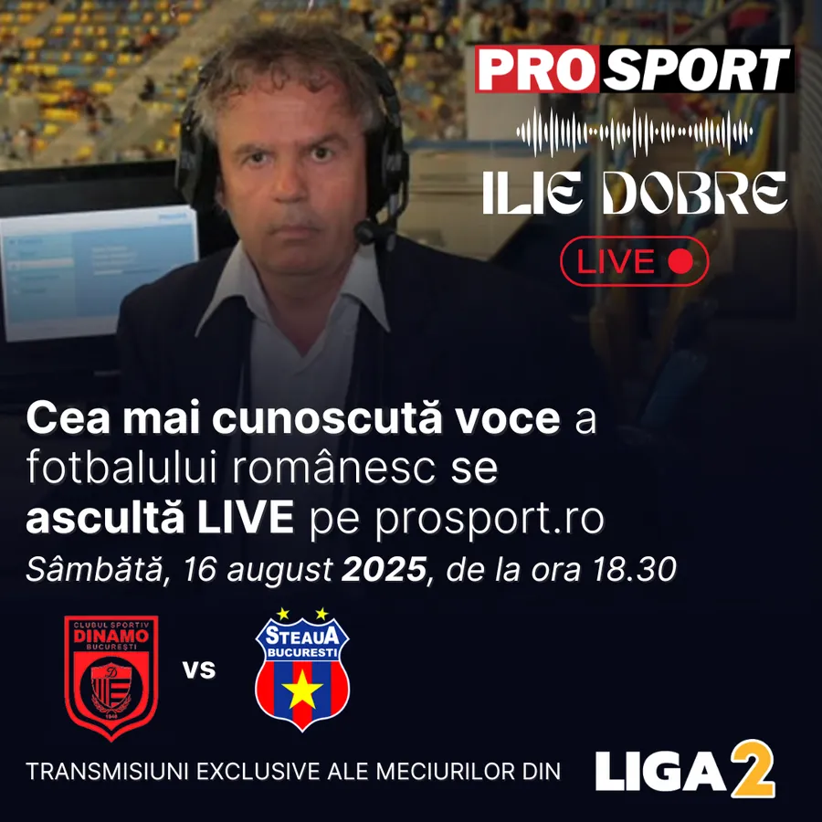 Ilie Dobre va comenta meciul de fotbal C.S. Dinamo București – Steaua București, sâmbătă, 16 august 2025, de la ora 18.30. Comentariul LIVE va putea fi ascultat pe site-urile ProSport și LIGA 2, dar și pe paginile de Facebook și YouTube ale acestora.