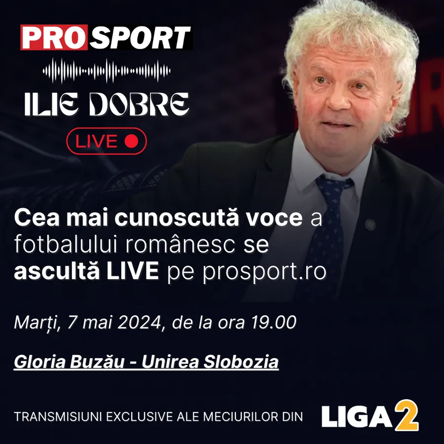 Ilie Dobre comentează LIVE pe ProSport.ro meciul Gloria Buzău – Unirea Slobozia, marți, 7 mai 2024, de la ora 19.00