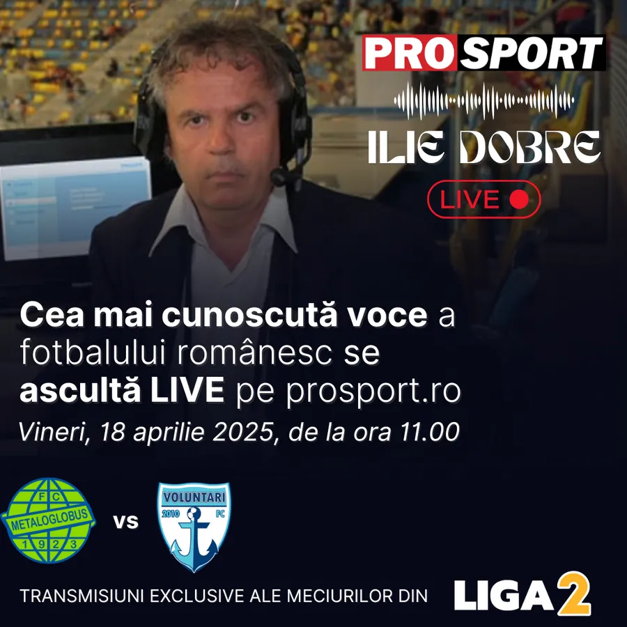 Ilie Dobre comentează LIVE pe ProSport.ro meciul Metaloglobus București – F.C. Voluntari, vineri, 18 aprilie 2025, de la ora 11.00