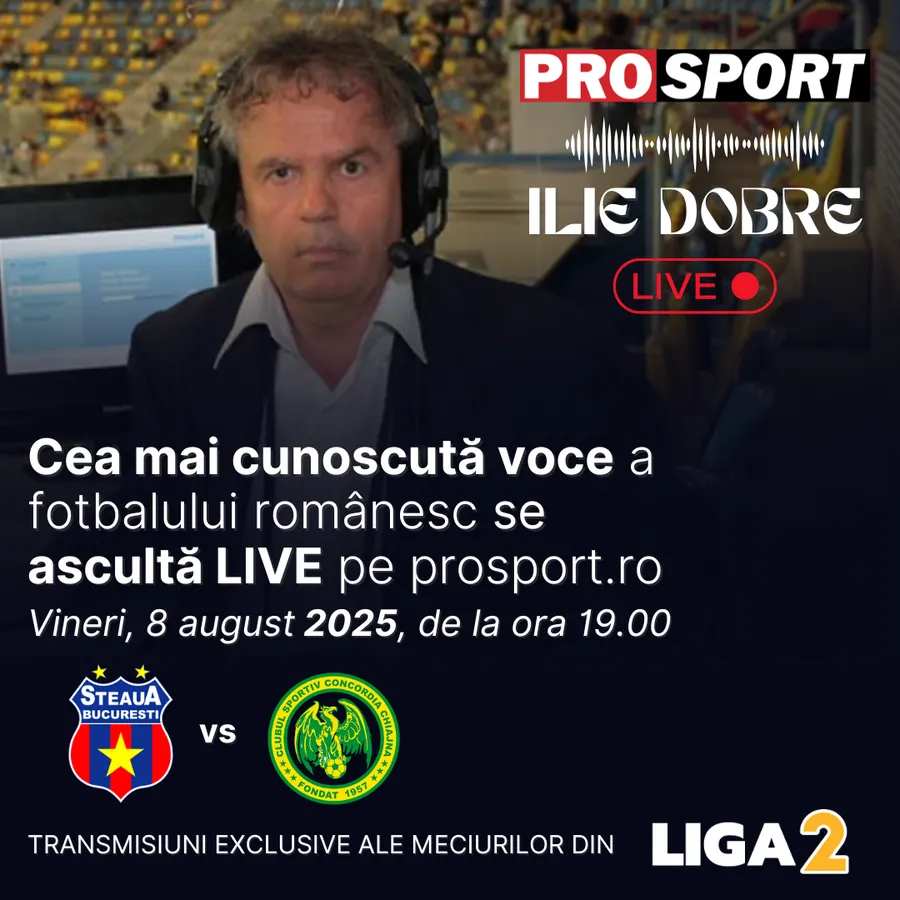 Ilie Dobre va comenta meciul de fotbal Steaua – Concordia Chiajna, vineri, 8 august 2025, de la ora 19.00. Comentariul LIVE va putea fi ascultat pe site-urile ProSport și LIGA 2, dar și pe paginile de Facebook și YouTube ale acestora.