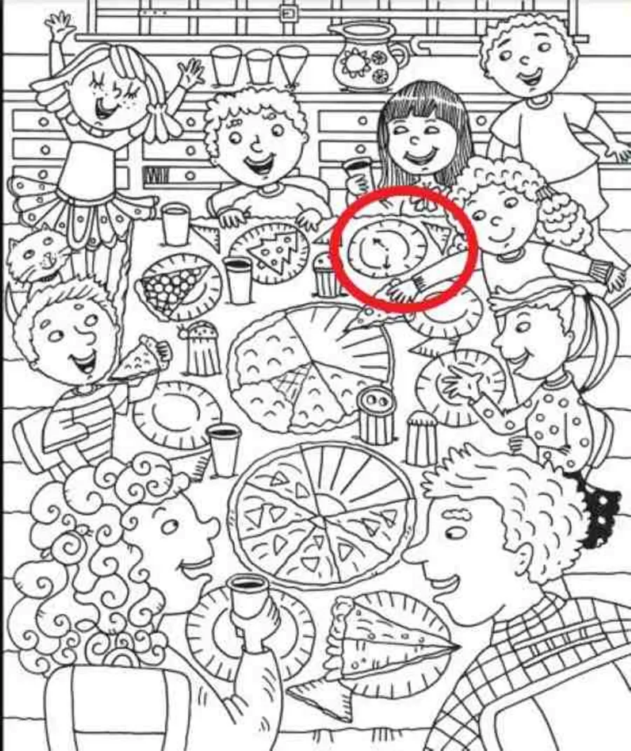Așadar, ceasul se află în partea de sus a imaginii, în una dintre farfurii. Așa cum puteți observa, sunt desenate cele două linii care indică ora și minutul. Din cauza iluziei optice create, a fost destul de dificil de identificat, însă nu imposibil.