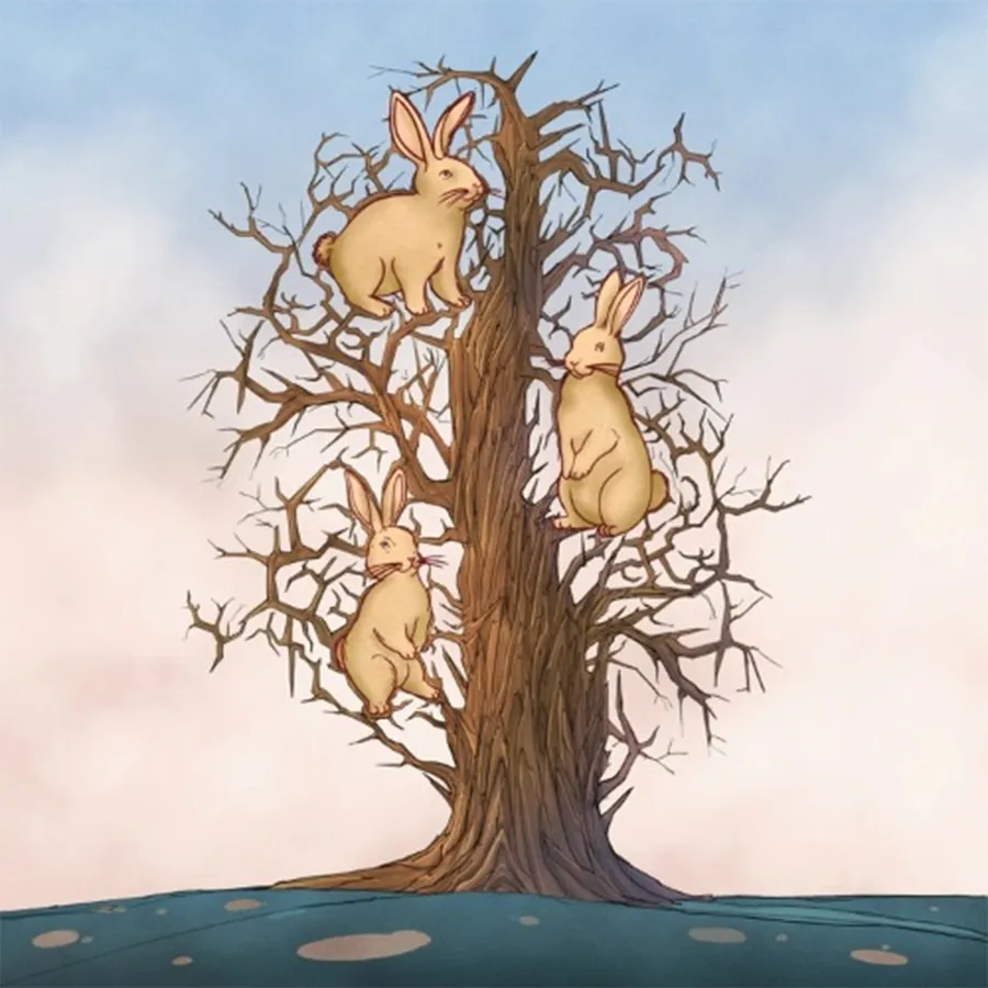 În imagine, apare un copac mare cu foarte multe crengi, care stau în diferite direcții. Printre ele se află ascunși cei trei iepuri, însă trebuie să fiți foarte atenți. Îi puteți vedea? Priviți cu atenție poza de mai jos și găsiți animalele!