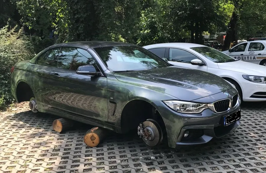 Ce a rămas în urma vestiților hoți din ”Banda lui Pampon”? BMW-ul în valoare de 50.000 de euro pe butuci, lesne de înțeles, cu roțile furate. Numai jențile costă aproximativ 2.000 de euro. Proprietarul bolidului, care este chiar patronul unui restaurant cunoscut din Herăstrău, a rămas mut de uimire când și-a văzut ”bijuteria” în așa hal. A anunțat imediat Poliția, care a demarat ancheta.