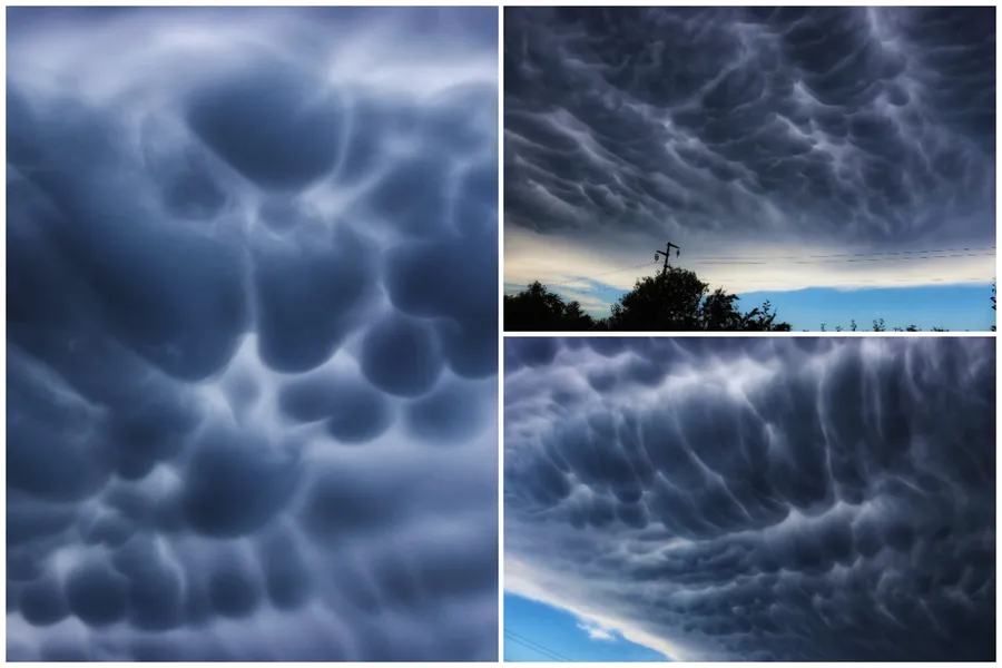 „Norii Mammatus, cei care au încântat privirile gorjenilor în această seară! Formarea acestora este în strânsă relație cu forfecarea ridicată a vântului din altitudine, întrucât acesta i-a modelat, luând naștere aceste pungi de umiditate, în contextul unei mase de aer instabil!