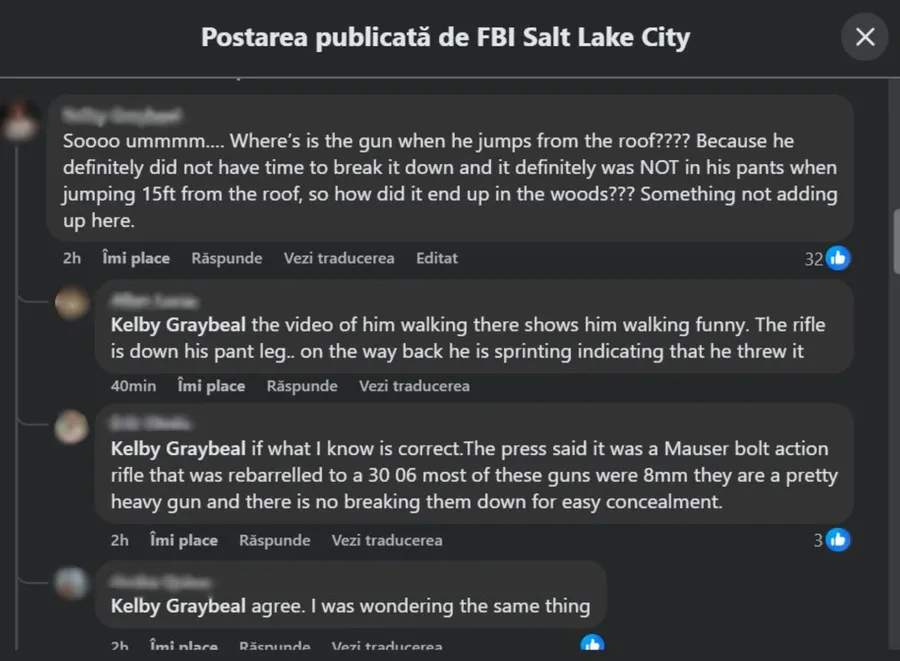 „Deci, unde se afla arma când a sărit de pe acoperiș? Pentru că sigur n-a avut timp să o demonteze și cu siguranță nu se afla în pantalonii lui când a sărit 4,5 metri de pe acoperiș, deci cum a reușit să ajungă în pădure?”, a întrebat o persoană pe platforma de socializare Facebook.