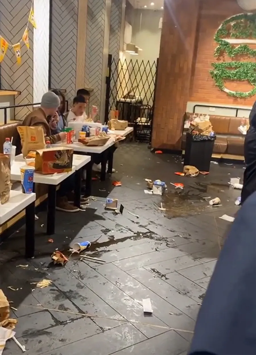 Imaginile au devenit virale pe rețelele de socializare, mulți utilizatori minunându-se de mizeria lăsată de un grup de persoane, în restaurantul respectiv. În imaginea de mai jos se pot observa resturi de mâncare, pahare de suc, ambalaje și cutii pe jos și pe mese. Unii dintre clienți au și aruncat cu paharele de suc, motiv pentru care lichidul din recipient a fost împrăștiat pe podea.